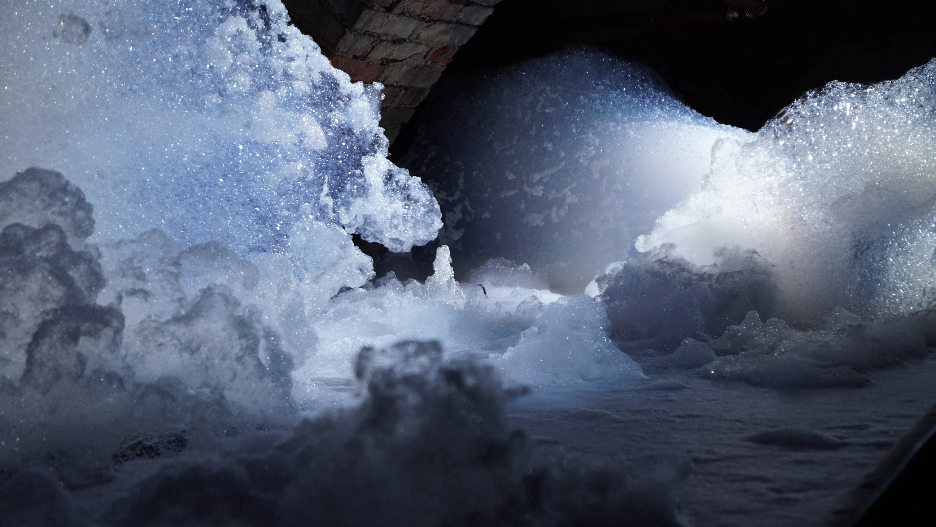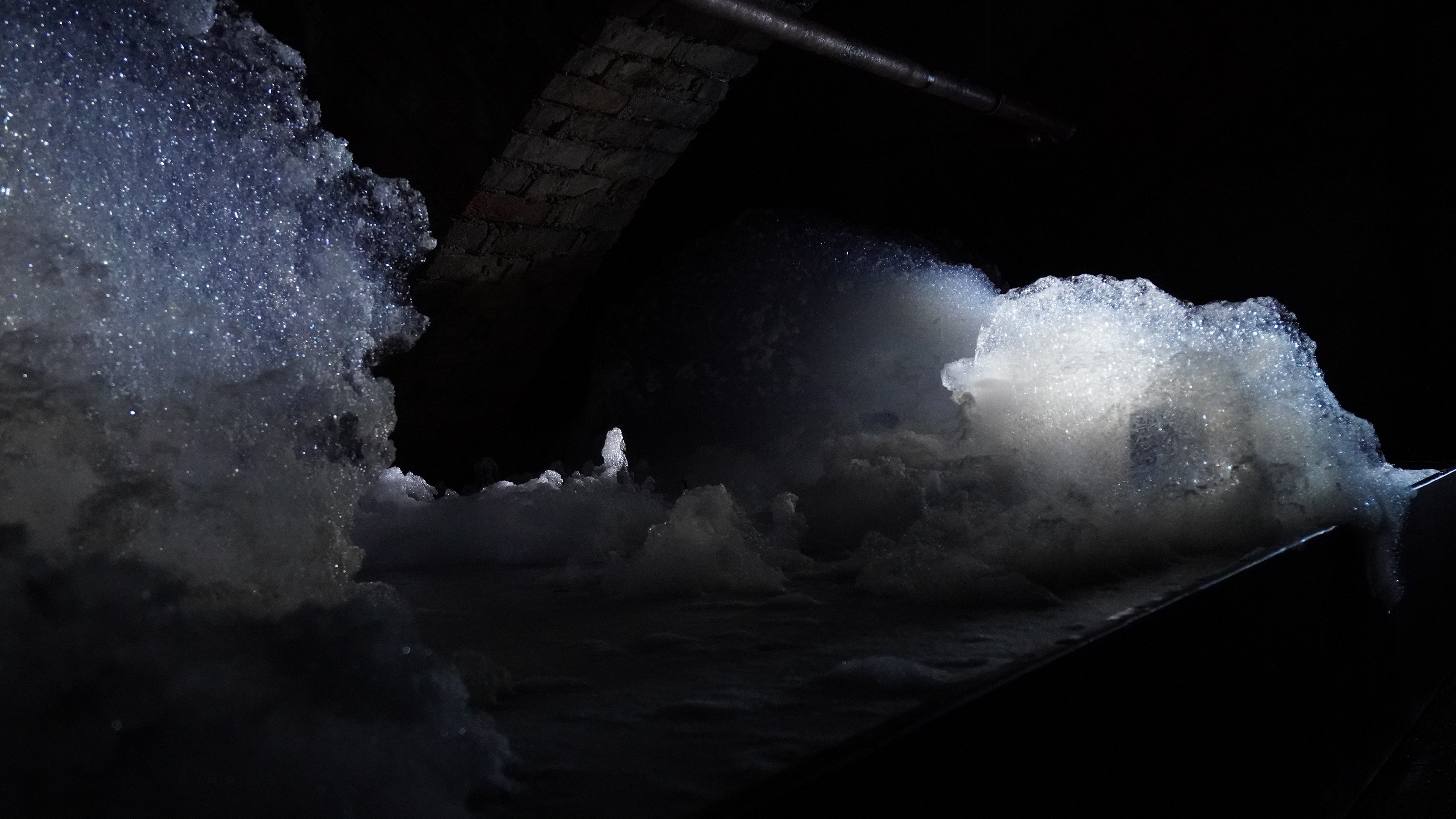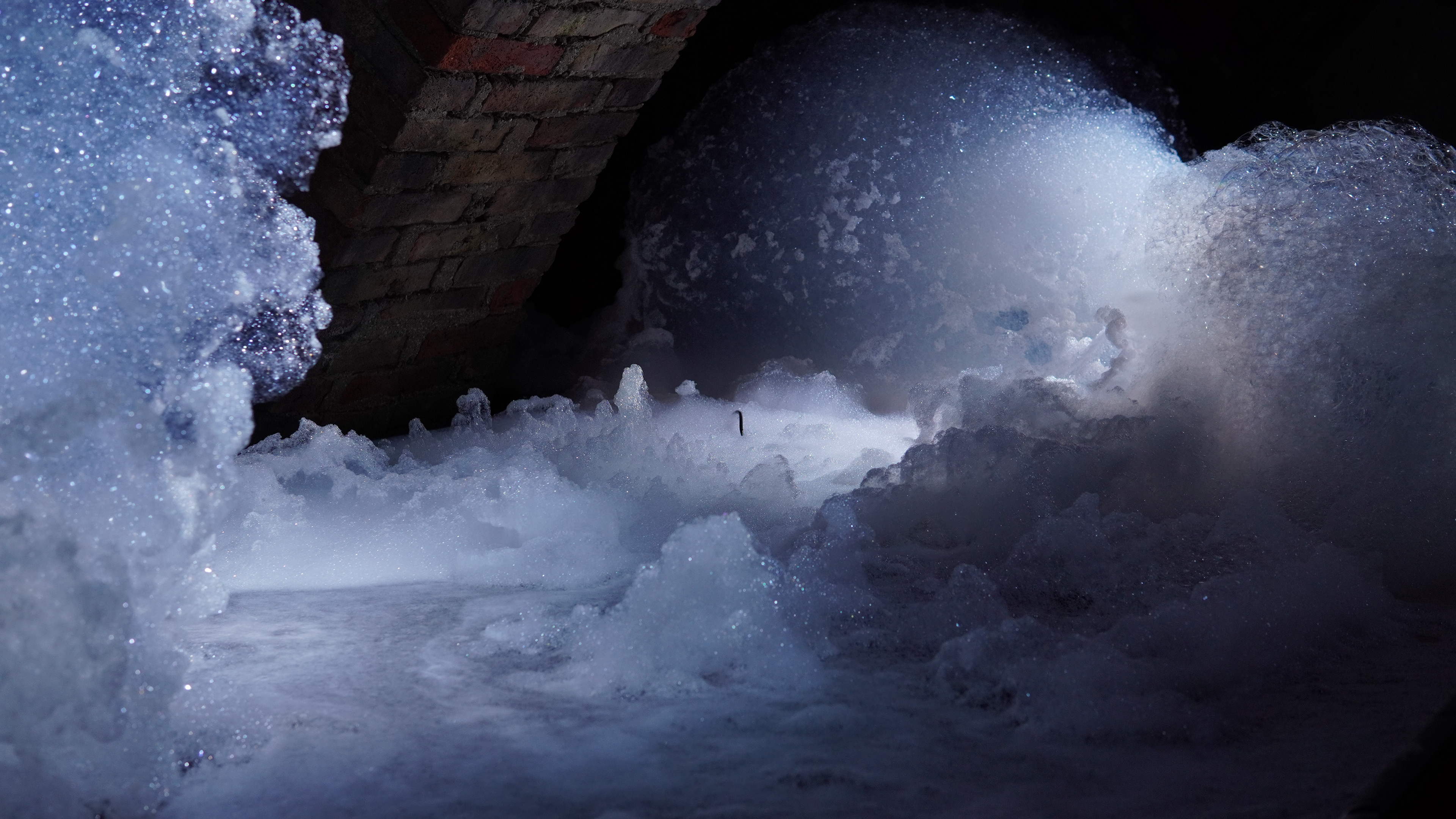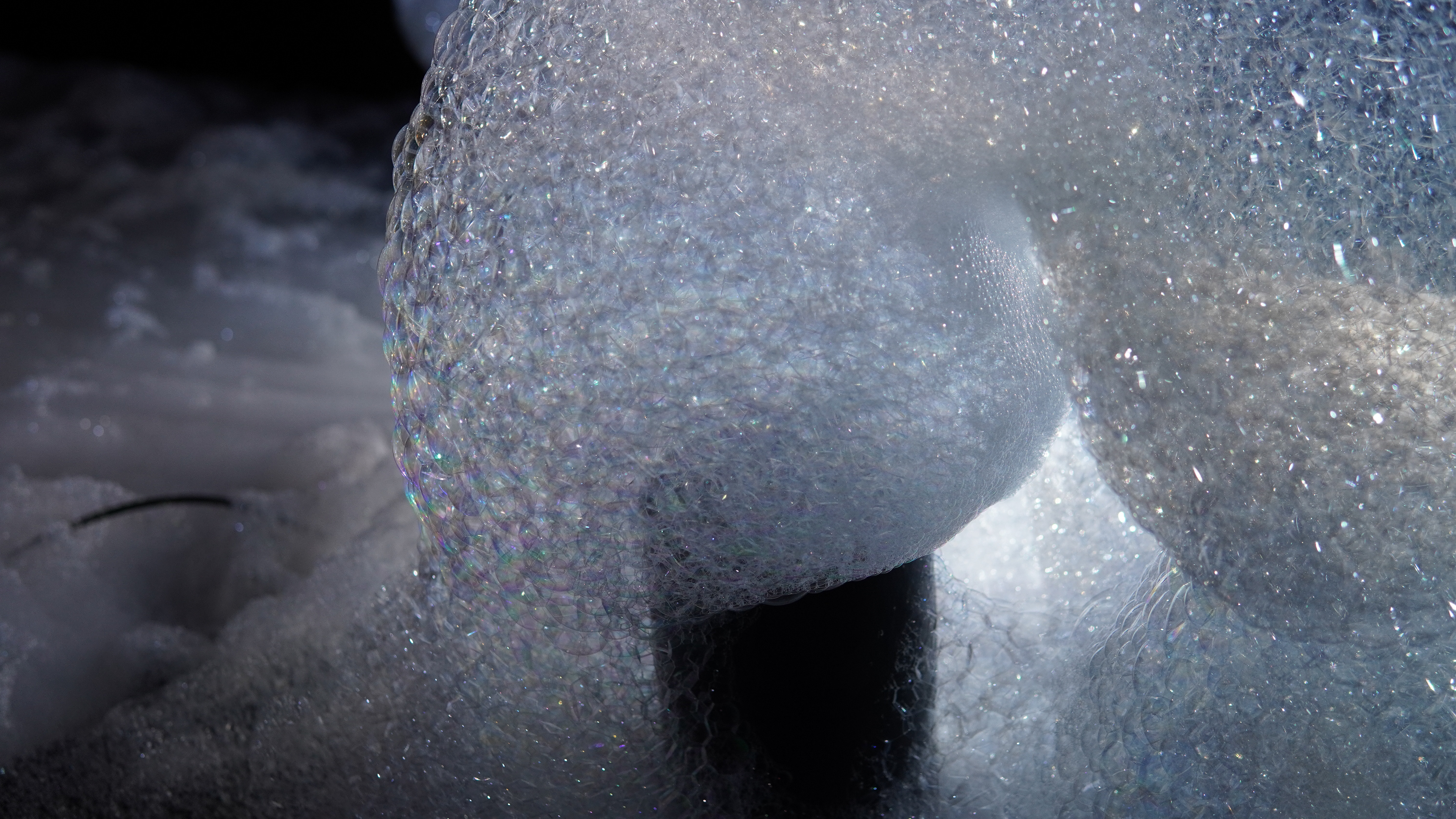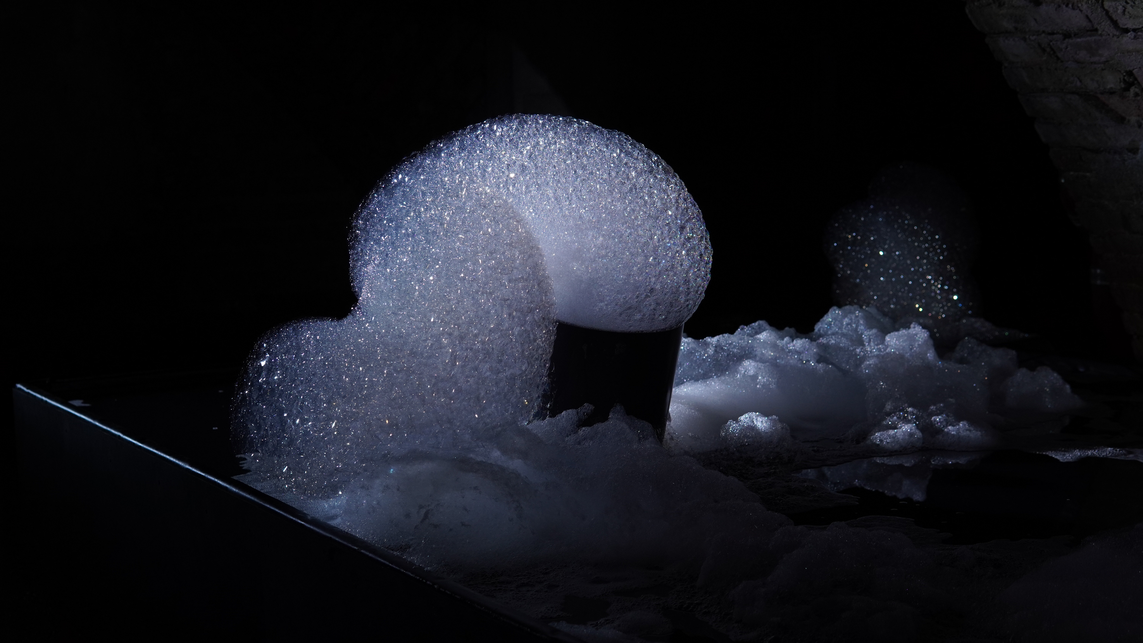 In der theatralen Installation EPHEMERAL LANDSCAPES werden sich ständig transformierende und auflösende Schaumlandschaften erzeugt.