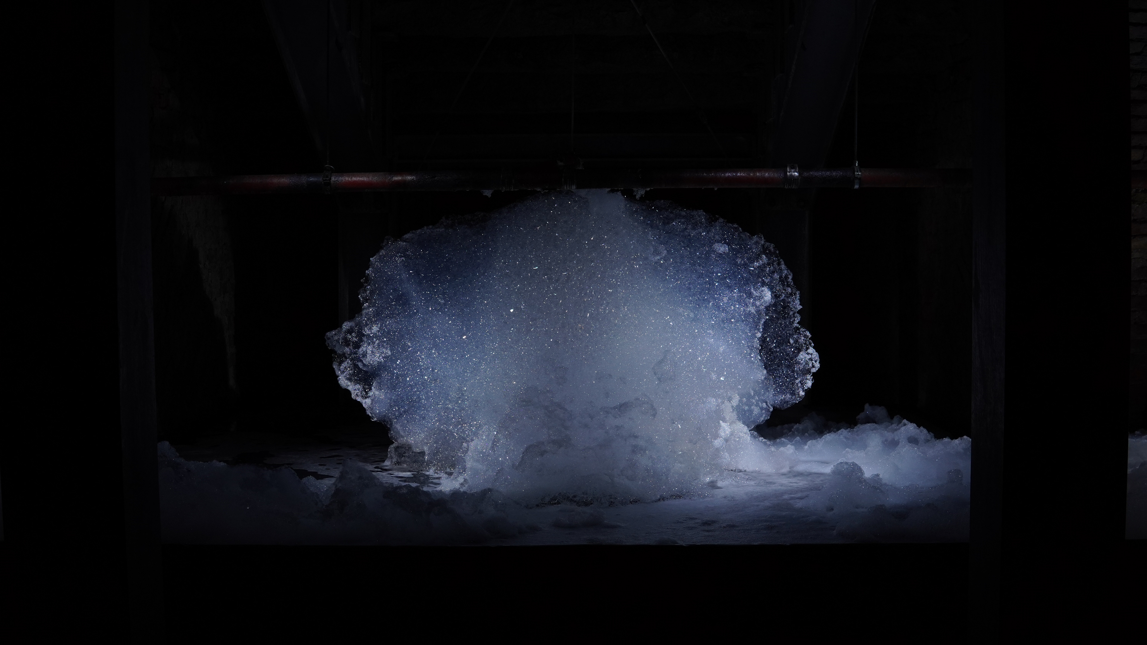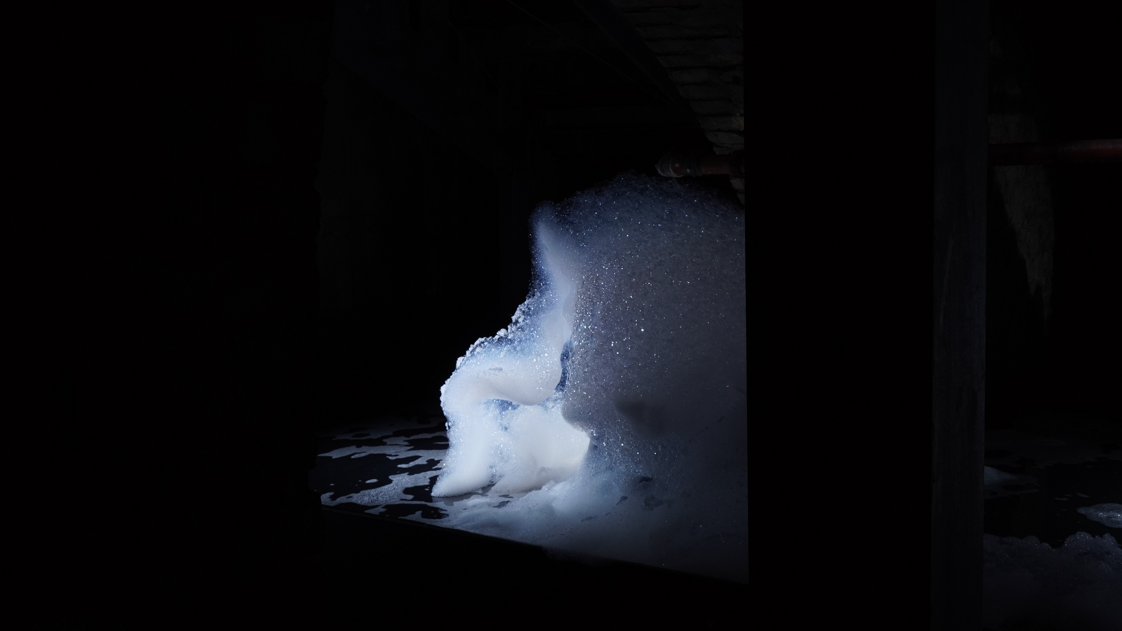 Ausgehend von der Frage, wie Wasser als Material eine Handlungsmacht bekommen kann, wird durch die Zugabe von Luft, Tensiden und Licht eine Welt geschaffen, die einem Rhythmus folgt und flüchtig ist. Die Zuschauer*innen sind dazu eingeladen, in der dabei entstehenden Choreographie existierende oder imaginäre Landschaften zu entdecken und den immer im Wandel begriffenen und vergänglichen Formen Aufmerksamkeit zu schenken.